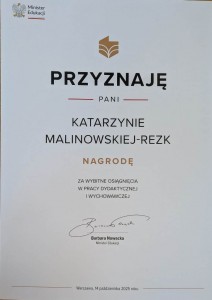 Z ogromną dumą i radością informujemy, że Pani Katarzyna Malinowska-Rezk, nauczycielka naszego Ośrodka, została uhonorowana Nagrodą Ministra Edukacji Narodowej za wybitne osiągnięcia w pracy dydaktycznej i wychowawczej!