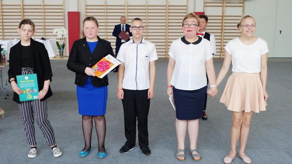 Ciepłe uczucia wywołał film przypominający najważniejsze wydarzenia mijającego roku, rozczulał widok wychowanków dumnych z nagród i świadectw, płynęły serdeczne łzy, gdy Wiktoria (kl. III gimnazjum), Kuba i Kacper (kl. VIII) wspomagani przez Olę (kl.VII) w imieniu ostatniego rocznika gimnazjalistów i pierwszego rocznika ósmoklasistów wyśpiewali i przemigali nauczycielom, rodzicom i kolegom przepiękną piosenkę, o jakże wymownym refrenie: „Dziękujemy wam!”