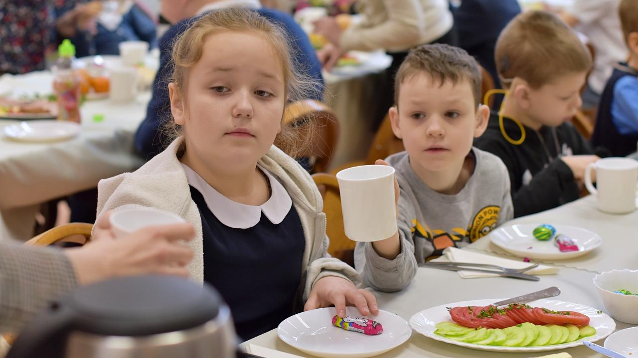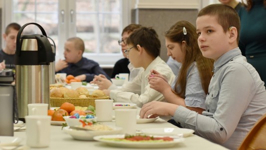Cała szkolna społeczność zasiadła przy jednym stole jak wielka rodzina, by spożyć wspólne świąteczne śniadanie.