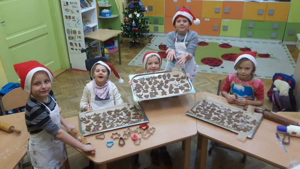 Pierwszoklasiści jak prawdziwi kucharze w fartuszkach piekły pierniki. Wałkowały ciasto, wycinały a na koniec lukrowały.